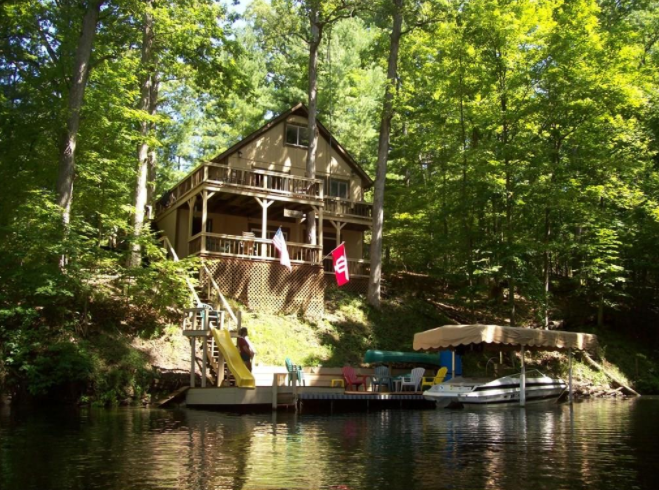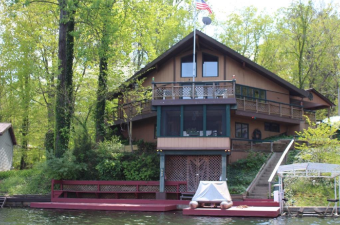 Description: Only one hour south of Indianapolis on private Lake Sweetwater known for recreational water sports and fishing. Beautiful Chalet style home with cathedral ceiling and lots of decking. An open concept floor design on 3 levels with lots of space for additional sleeping. Situated on two mature wooded lots providing space and privacy with 120 feet of water front on Indiana’s deepest and cleanest lake. Gorgeous view of the water in quiet idle zone not far from main body of lake.